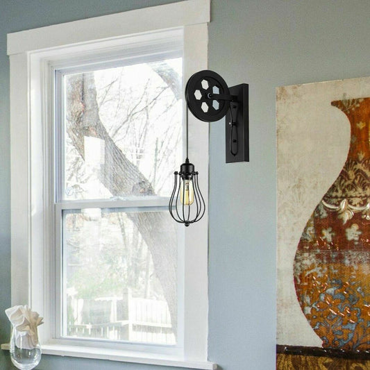 Retro Industrial Pulley Wheel Wall Light Fixture Metal Cage Indoor Light