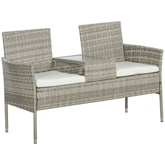 Outsunny Rattan Garden Bench w/ Glass Tea Table, Wicker Chair w/ Cushions, Grey