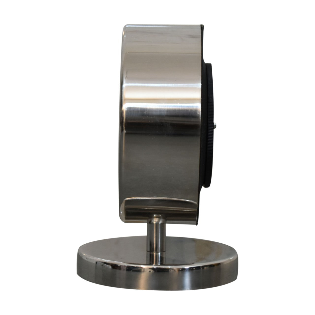 This round clock is a sleek addition to your bedside table. It offers a chrome frame and base with a simple face and overall minimalist look that will blend with many décor styles.