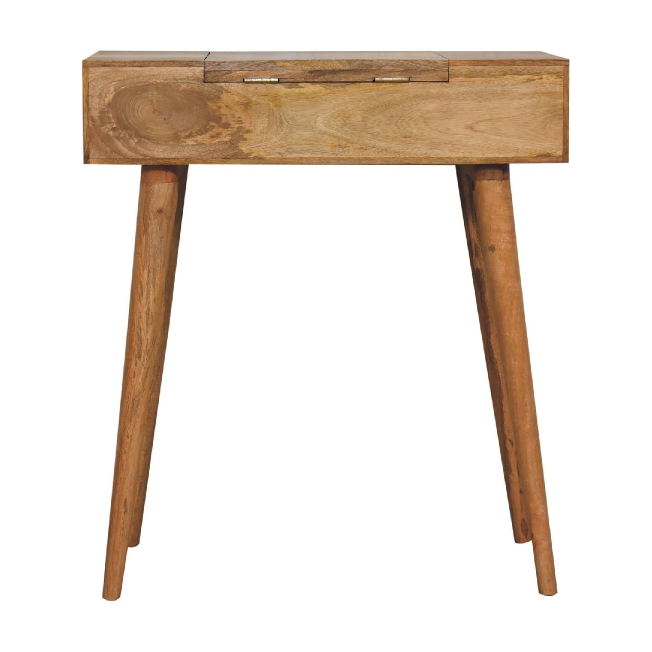 Add this beautiful dressing table to your home. Constructed from 100% solid mango wood in an Oak ish finish with 1 blush pink drawer, it features a foldable mirror and storage compartments for storing any bits and pieces. Other product features - include Nordic-style legs and a cutout slot for easy access into the drawer. A lovely versatile piece that will complement any room beautifully. This petite product is part of Recession Collection.. Depth: 35. Height: 78. Width: 70.