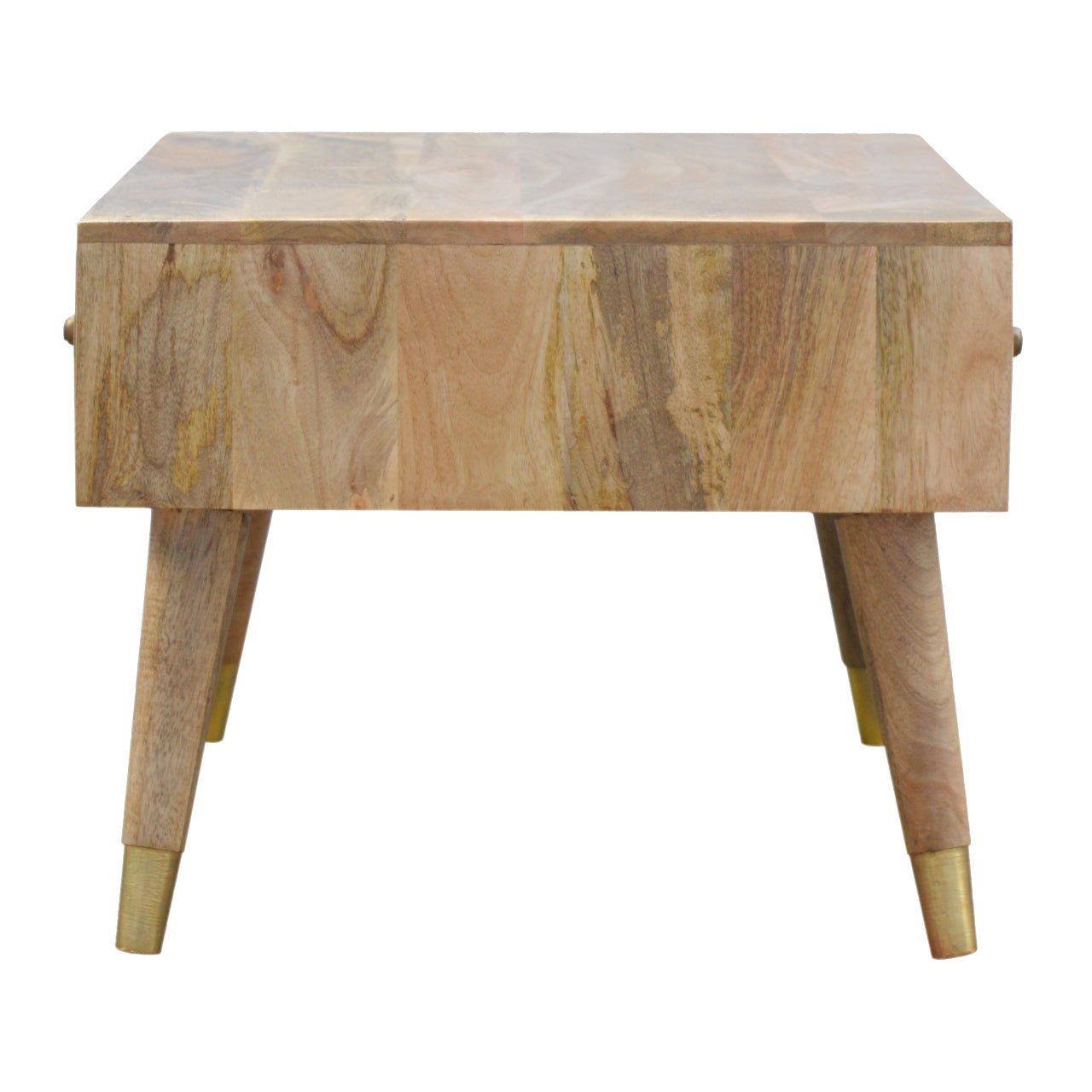 This solid timber coffee table is expertly constructed from 100% solid mango wood, and has a clean and simple design to suit most homes. It features 2 drawers featuring one beautiful golden brass insert on the drawer front, 4 Scandinavian styled legs which have golden plating on the feet for extra detail and a decent sized table top for placing any magazines, candles or small ornaments and plants.