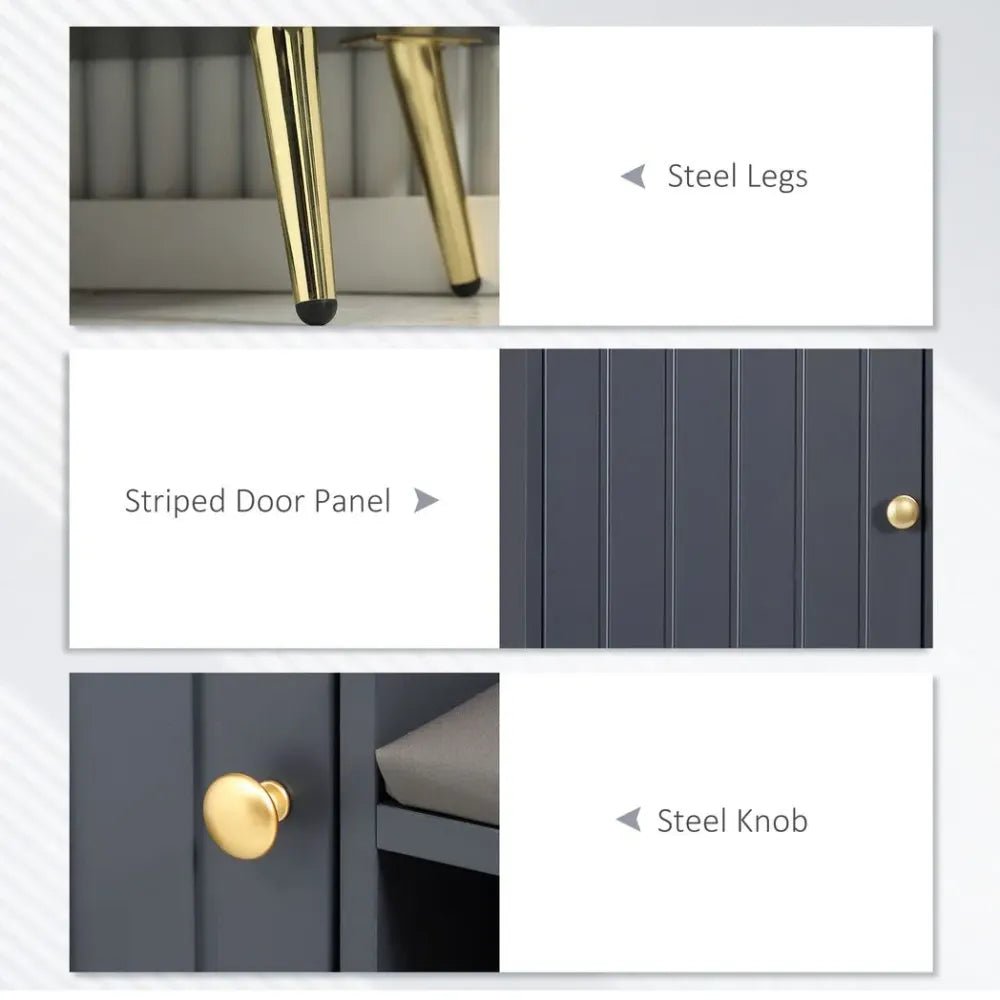 Modern style: Built in striped-pattern panel and neutral colour, this shoe rack for entryway blends well with most stylish home setups. Can be used as a shoe storage bench in the entryway or a small bench seat in the cloakroom, bedroom, living room, and more.Large storage space: The shoe rack bench comes with a door cupboard and an open shelf for your sundries and shoes, providing spacious space for up to four pairs of shoes. The countertop creates a mini coffee table for you to hold cups, books and other decorative pieces.Comfort seat: Featuring a thick padded cushion wrapped in smooth PU leather, the entryway shoe organizer offers a comfortable sitting experience.Sturdy structure: The selected particle board frame with steel legs makes this shoe bench sturdy and strong enough to hold all your shoes while you use it as a bench seat at the same time. Take your shoes off and organized them nicely on the shoe bench while you walk around your house free of dirt.Entryway bench info: Overall Dimensions: 80W x 33D x 49H cm. Weight Capacity: 120 kg (bench), 10 kg (shelf). Assembly required.