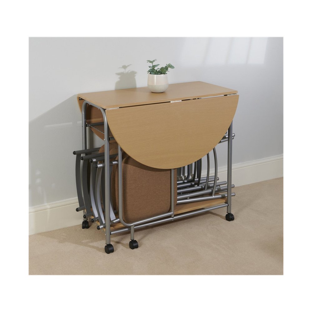 A smartly designed stowaway dining set for up to four people. The two tabletop end panels drop down and the four chairs fold and stack neatly under the table for a space saving footprint.