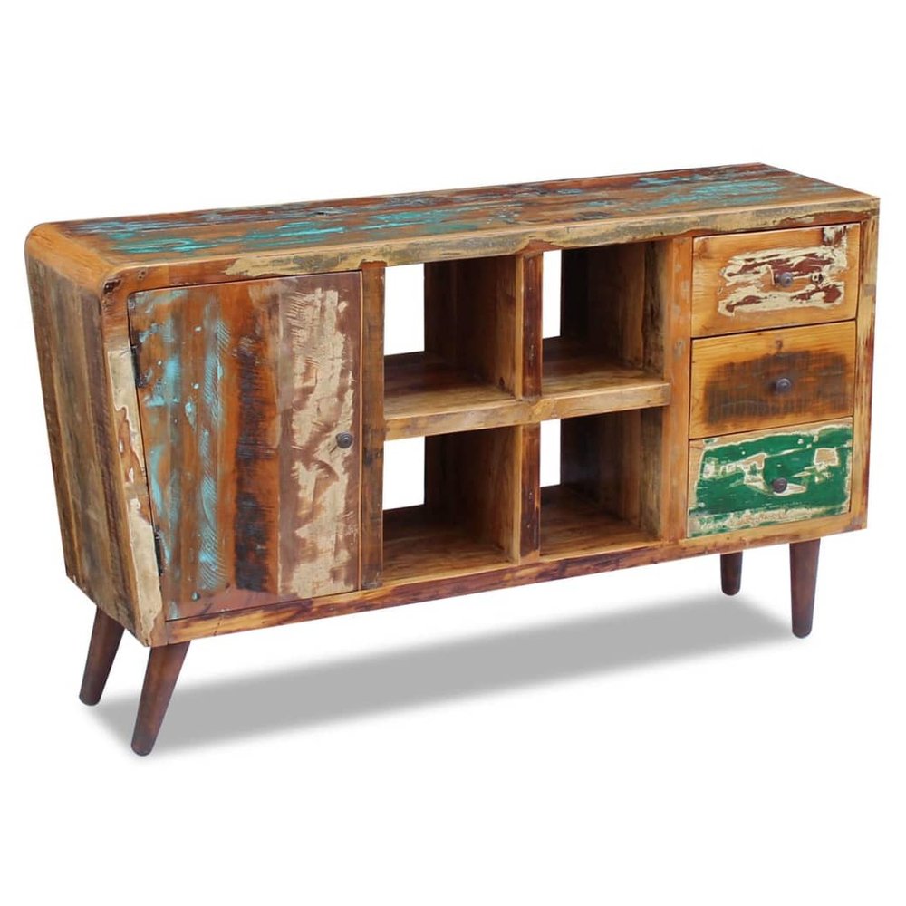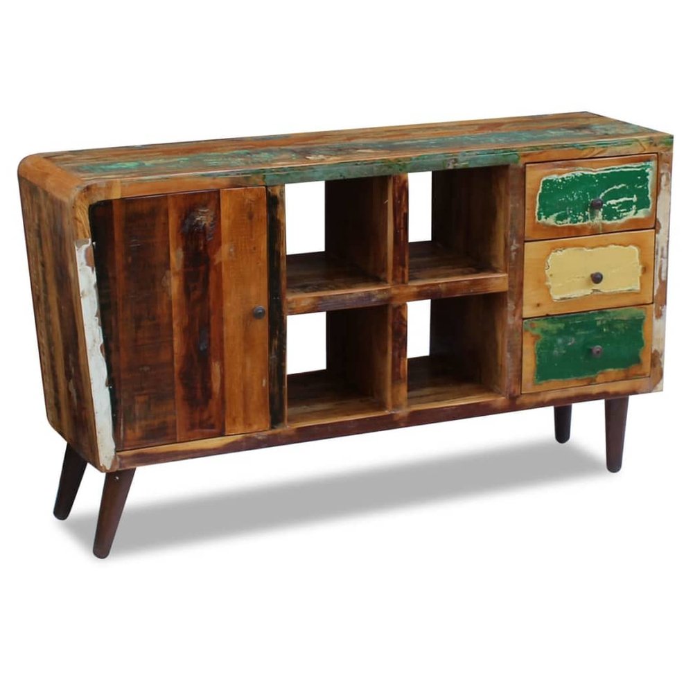 This wooden sideboard will make a unique addition to your room. Its solid wood construction makes it stable and secure to place drinks, fruit baskets or decorative items. The cabinet has four compartments, a door and three drawers to store small to medium items like photos, notepads and other necessaries. Made of reclaimed wood, the highboard is solid, durable and beautiful, and has the characteristics of different woods like teak, mango wood, acacia, recycled wood, hard wood, etc. Every piece of this furniture is unique, and slightly different from the next. Signs of wear and visible grain structure give each piece its own history and a unique look. This highboard is fully handmade. Every step of the process is carried out with the greatest care, be it polishing, painting or lacquering. Important note: Colours may vary from piece to piece, making each of our sideboards unique. The delivery is random.